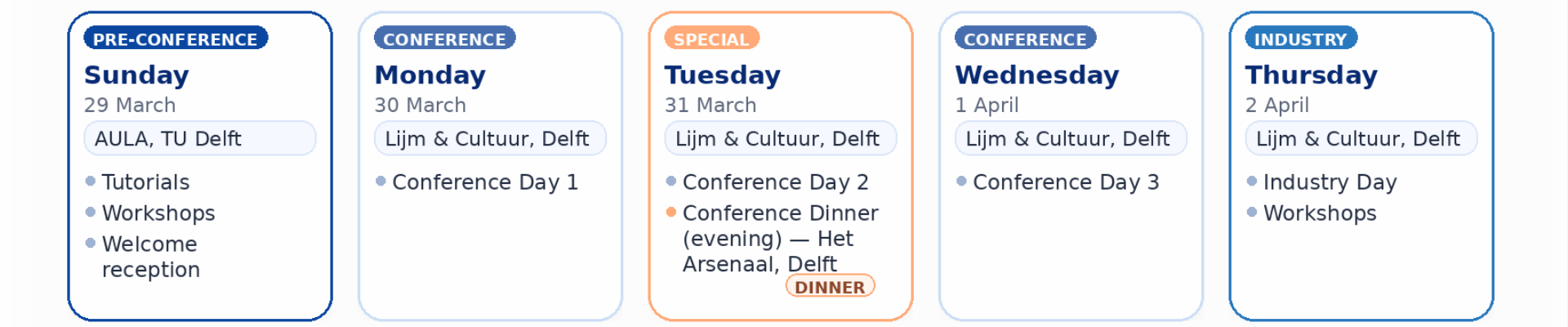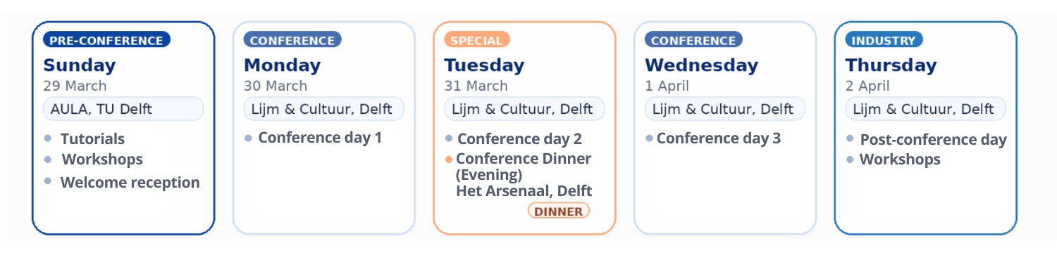 Join us for two signature moments to connect beyond the sessions: a relaxed welcome reception at the AULA (TU Delft), and a festive conference dinner at Het Arsenaal in the historic city centre of Delft.